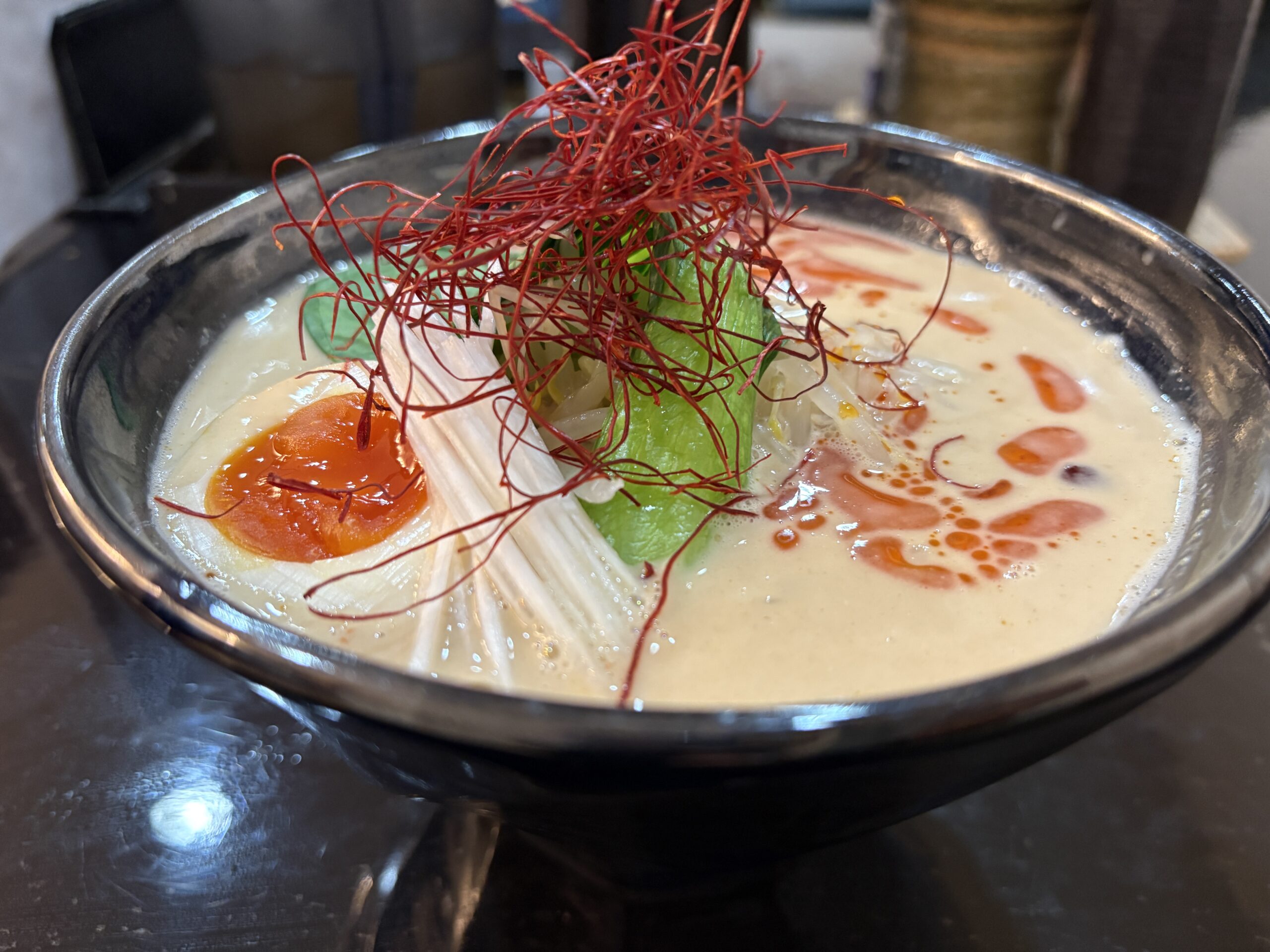 数分待って着丼!美しすぎる! 真っ白でクリーミーなスープに、鮮やかな赤いラー油と糸唐辛子、そして青梗菜の緑!このビジュアル、完全に視覚から食欲を刺激してきます。