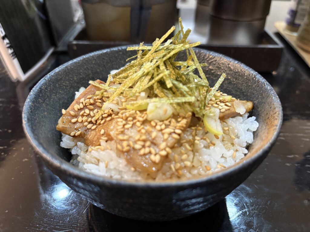 セットで頼んだ「ミニチャーシュー丼(350円)←セット価格」も、香ばしそうなチャーシューにたっぷりのゴマと刻み海苔が乗っていて、食べる前から勝利を確信しました。