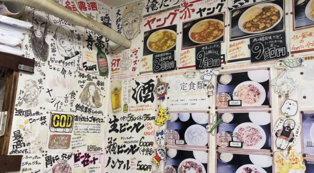 店内はカウンター席とテーブル席があり、決して広くはありませんが、それがまたいい味を出しているんです。壁には、大量のアニメキャラのイラストがずらり!