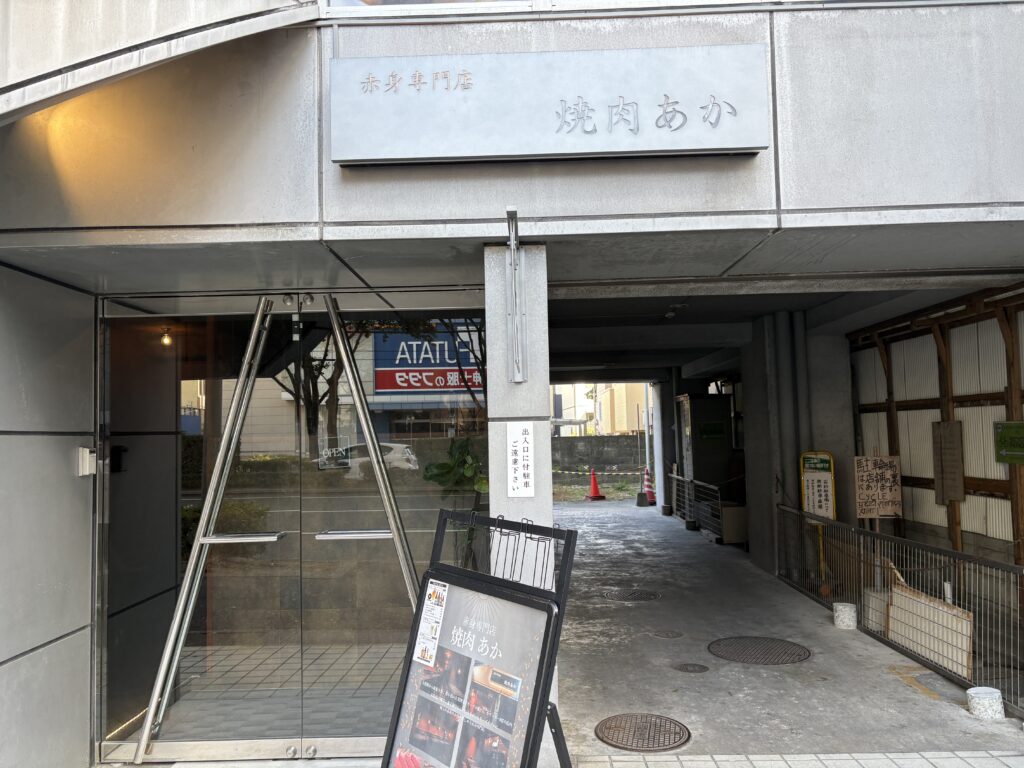 店名は「焼肉あか」ですが、決して派手な赤色ではありません! 写真の通り、シルバーの看板にコンクリートの壁という、まるでデザイナーズマンションのような洗練された外観です。