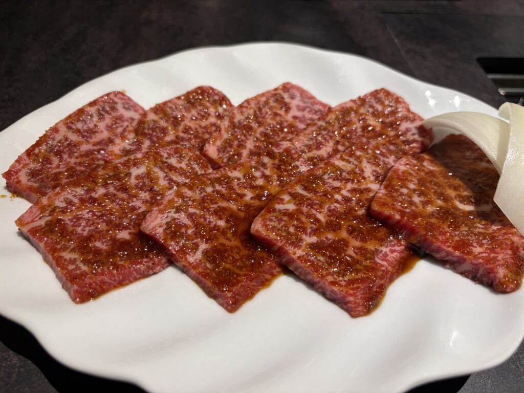 お皿に盛られた赤身肉の美しさといったら…。サシ(脂)が入りすぎていない、肉本来の旨味が詰まっていそうな鮮やかな赤色。