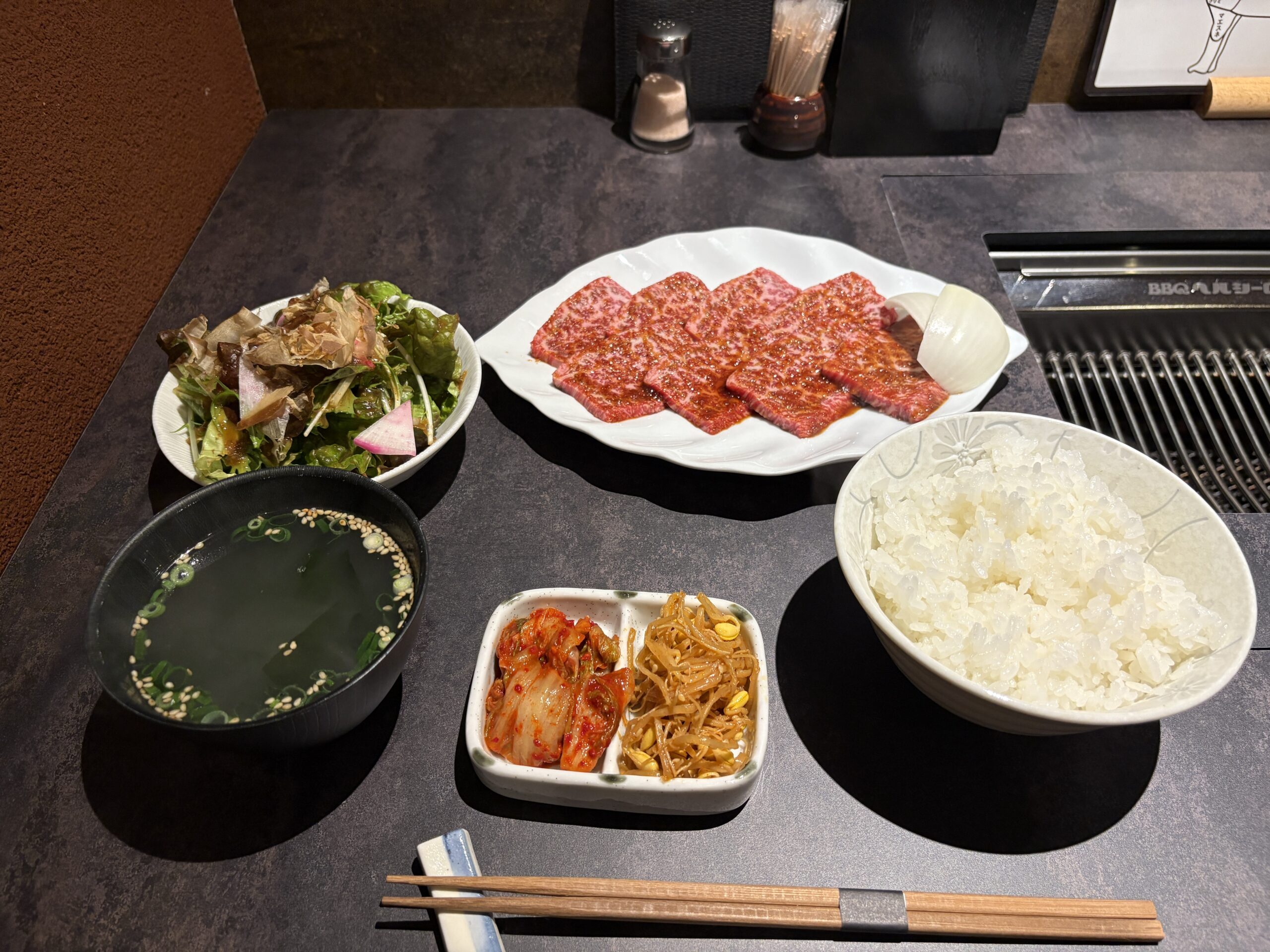 セット内容は「サラダ、ナムル、キムチ、スープ」付き。